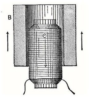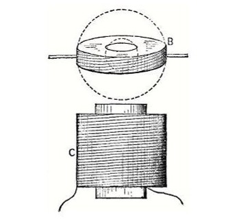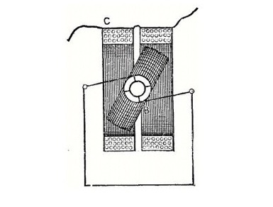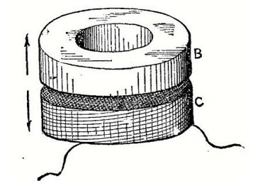 placed over a coil, B, mounted upon a horizontal axis, transverse to the axis of the coil, C. The terminals of