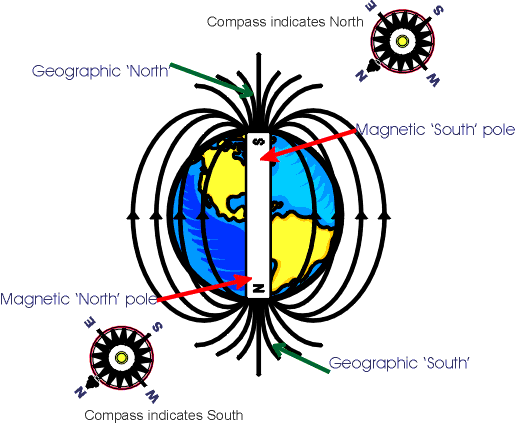 What is near the Geographic North Pole, a Magnetic North or a Magnetic South?